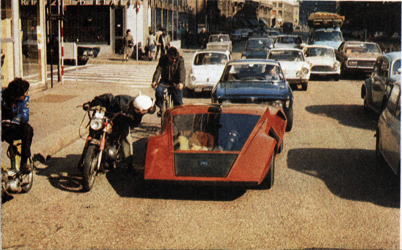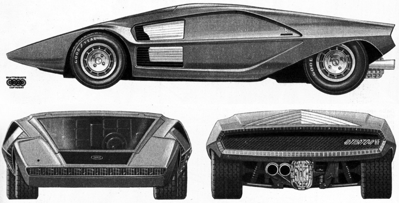 The Lancia Stratos Zero on a street in Italy and design illustrations, from Quattroruote March 1971.