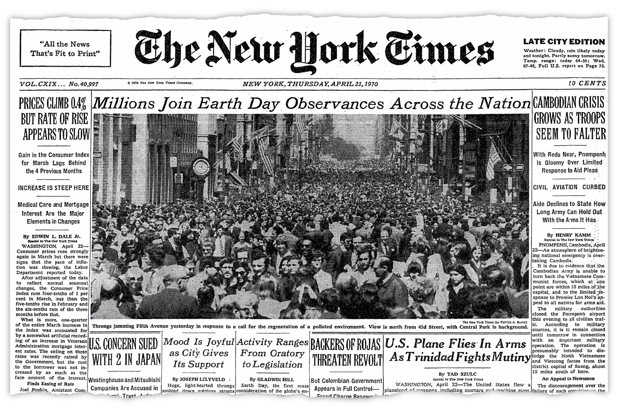 Top: New York Times cover the day after the successful first Earth Day, 23 April